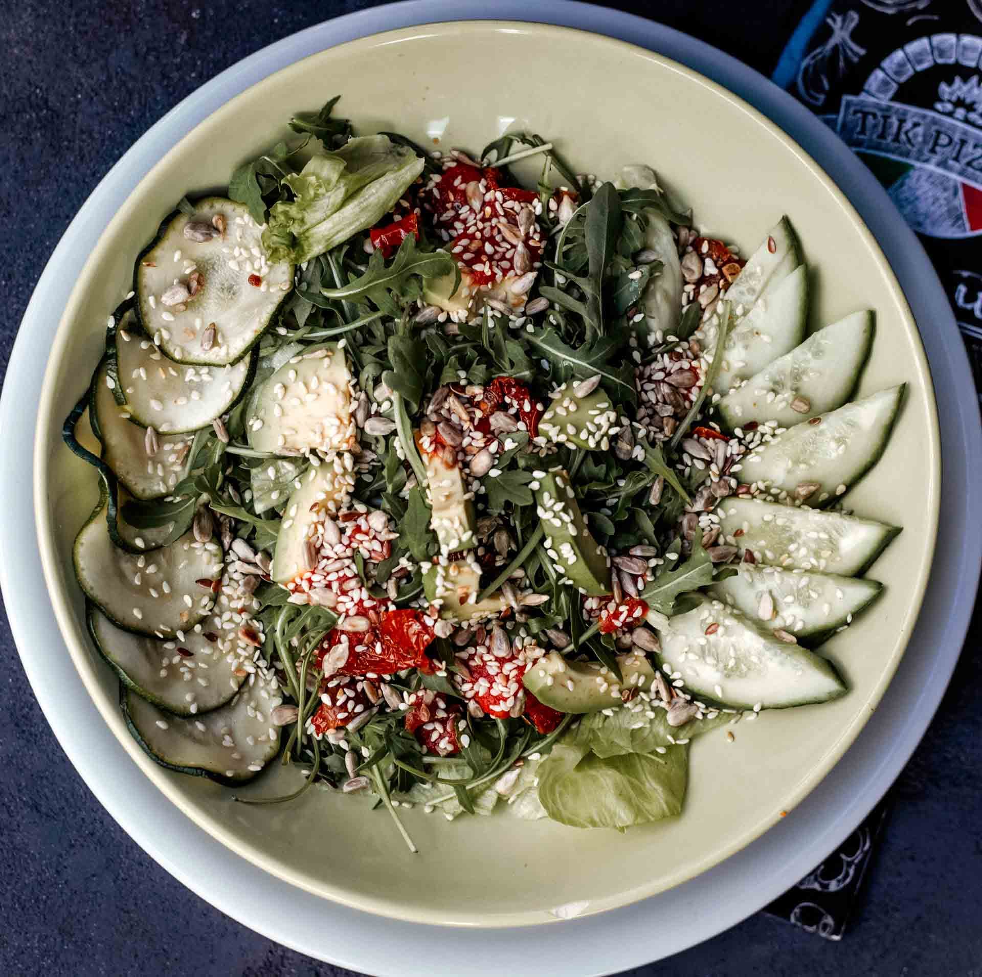 Salotų lapai, gražgarstės, keptos cukinijos, avokadai, agurkai, saulėje džiovinti pomidorai, kepintų sėklų mišinys (saulėgrąžos, sėmenys, sezamai), trintų pomidorų, aliejaus ir česnakų padažas. Patiekiama su šviežiai kepta duonele.