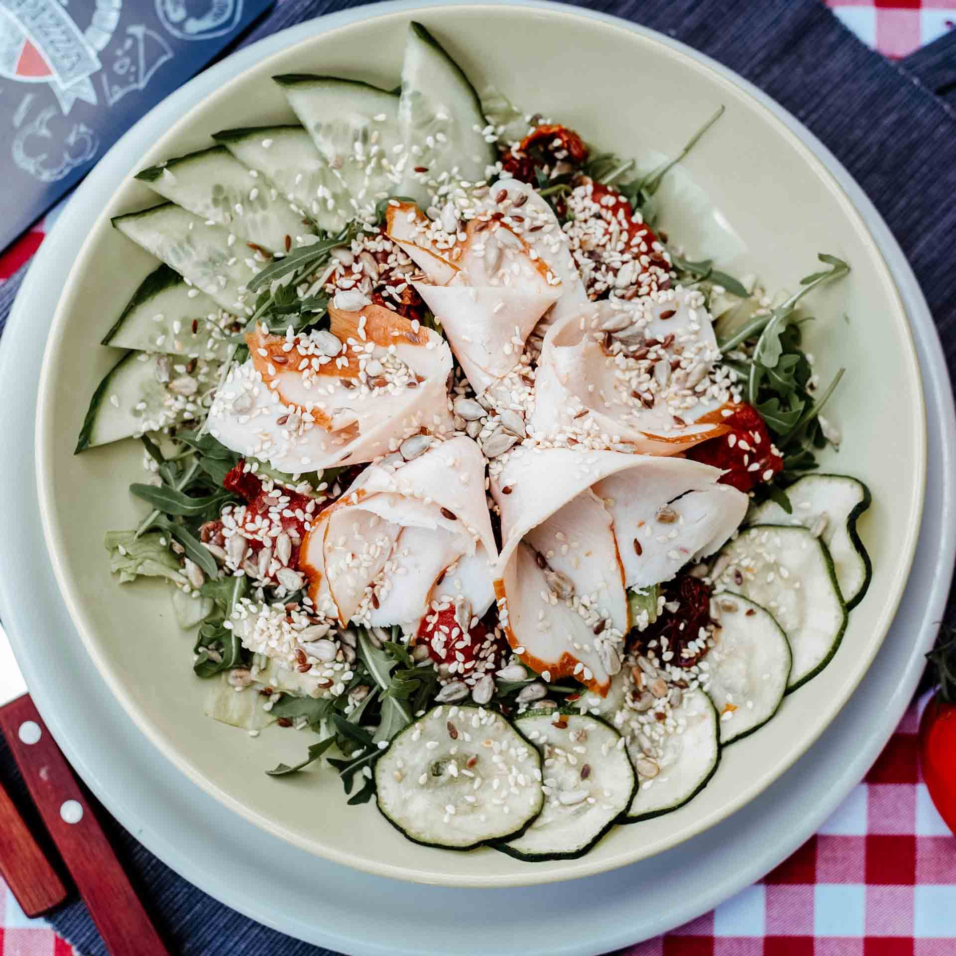 Salotų lapai, gražgarstės, keptos cukinijos, avokadai, agurkai, saulėje džiovinti pomidorai, vištiena, kepintų sėklų mišinys (saulėgrąžos, sėmenys, sezamai), trintų pomidorų, aliejaus ir česnakų padažas. Patiekiama su šviežiai kepta duonele.