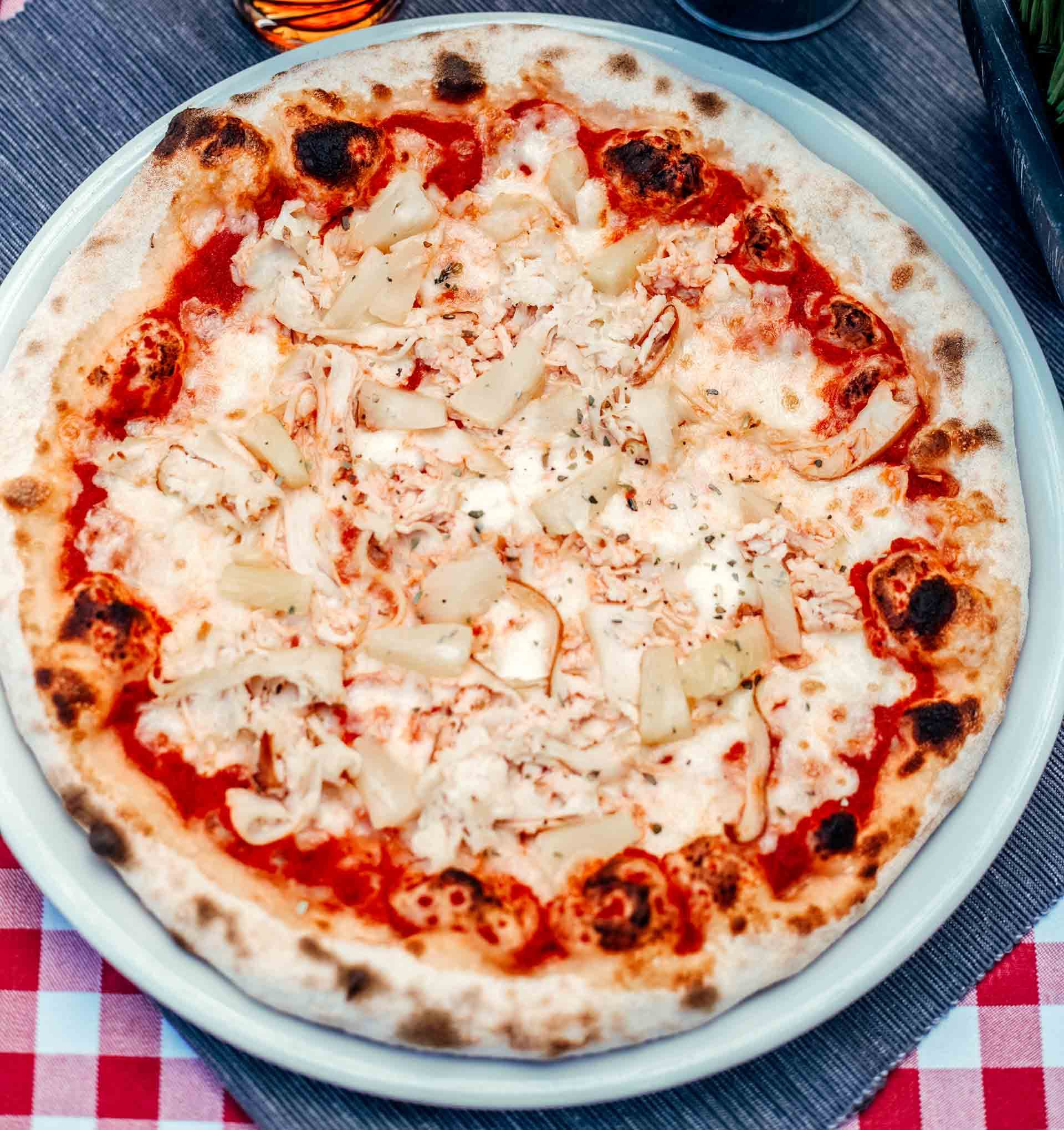 Pomidorų padažas, mocarelos sūris, vištiena, ananasai