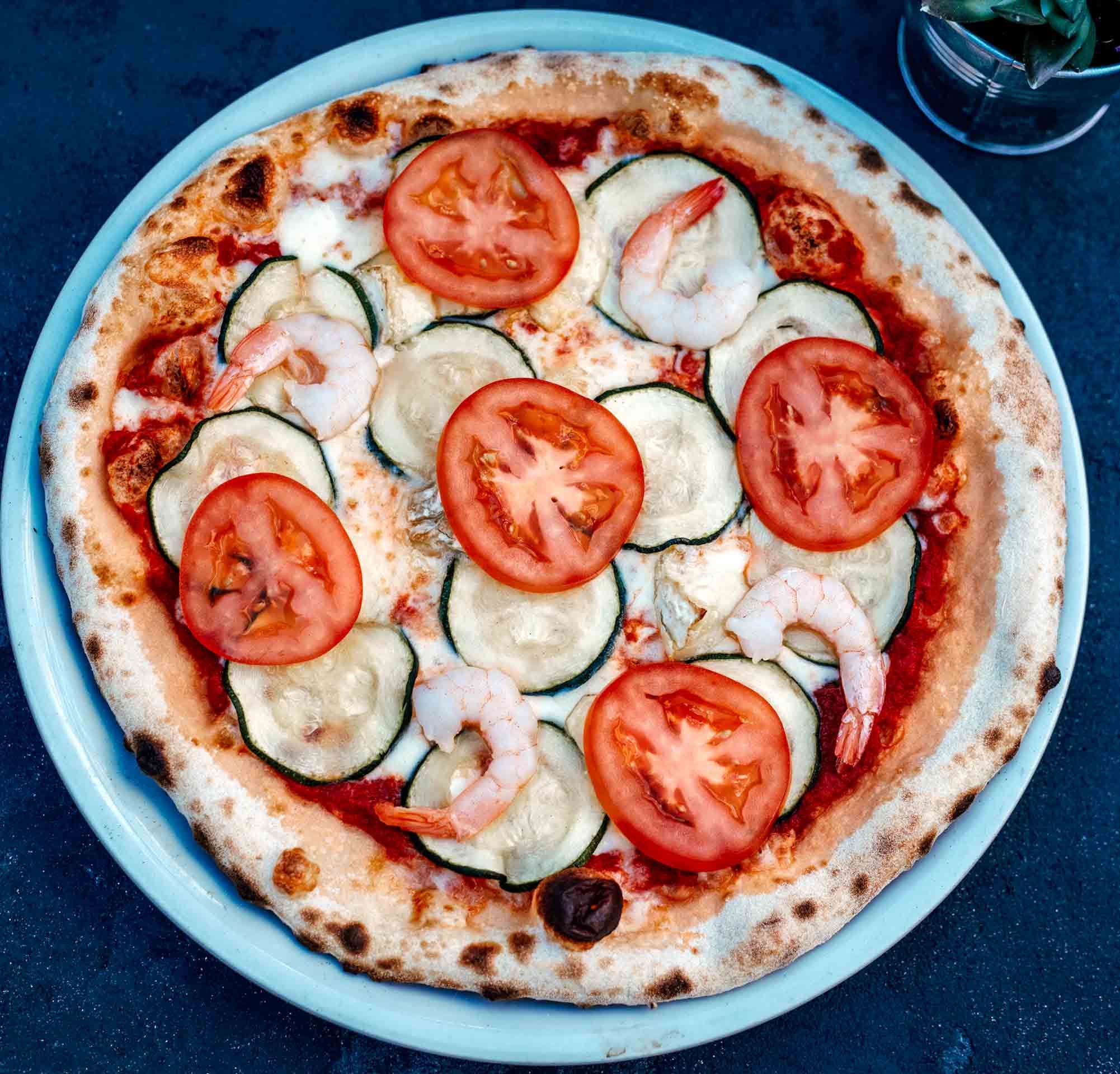 Pomidorų padažas, mocarelos sūris, kepintos cukinijos, bri sūris, krevetės, švieži pomidorai