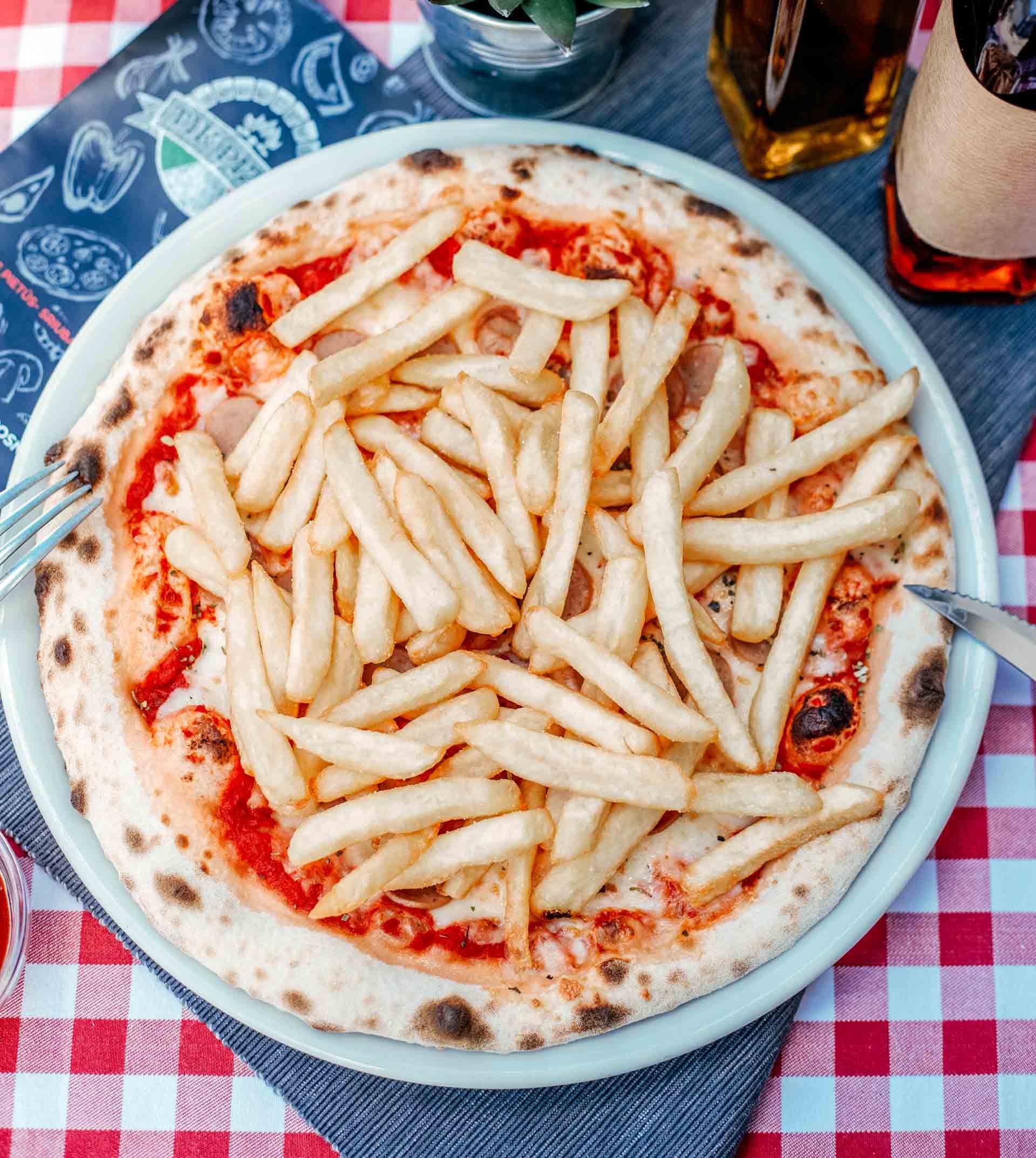 Pomidorų padažas, mocarelos sūris, pieniškos dešrelės, gruzdintos bulvytės