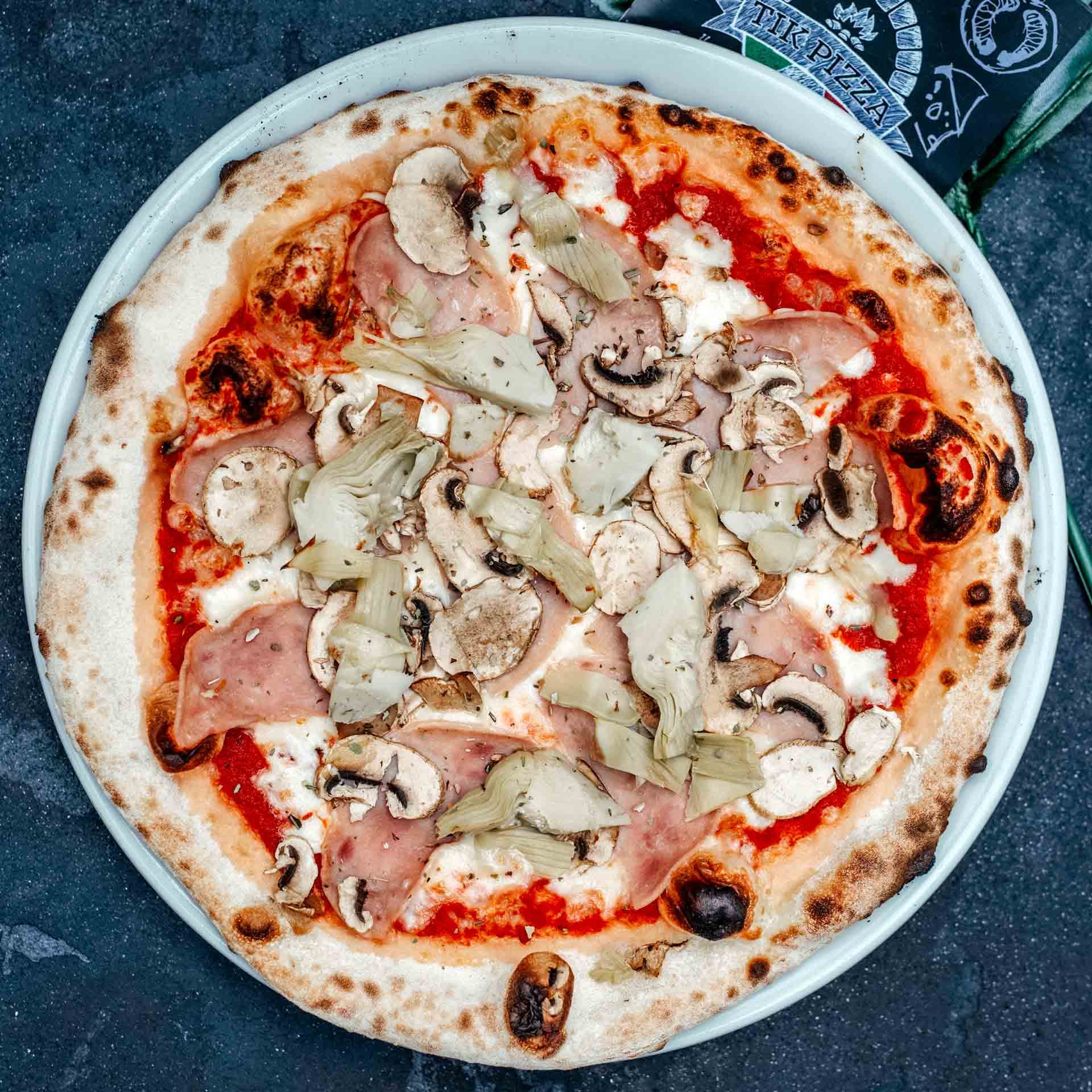 Pomidorų padažas, mocarelos sūris, virtas kumpis, grybai, marinuoti artišokai