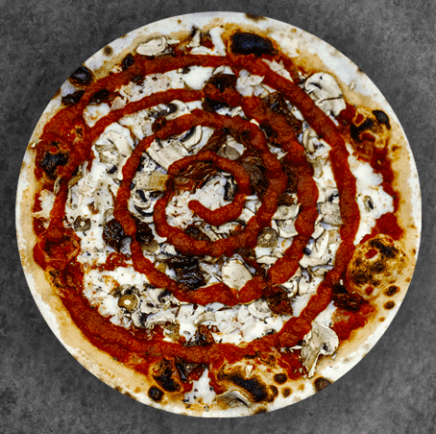 Pomidorų padažas, mocarelos sūris, vištiena, grybai, saulėje džiovinti pomidorai, česnakinis padažas