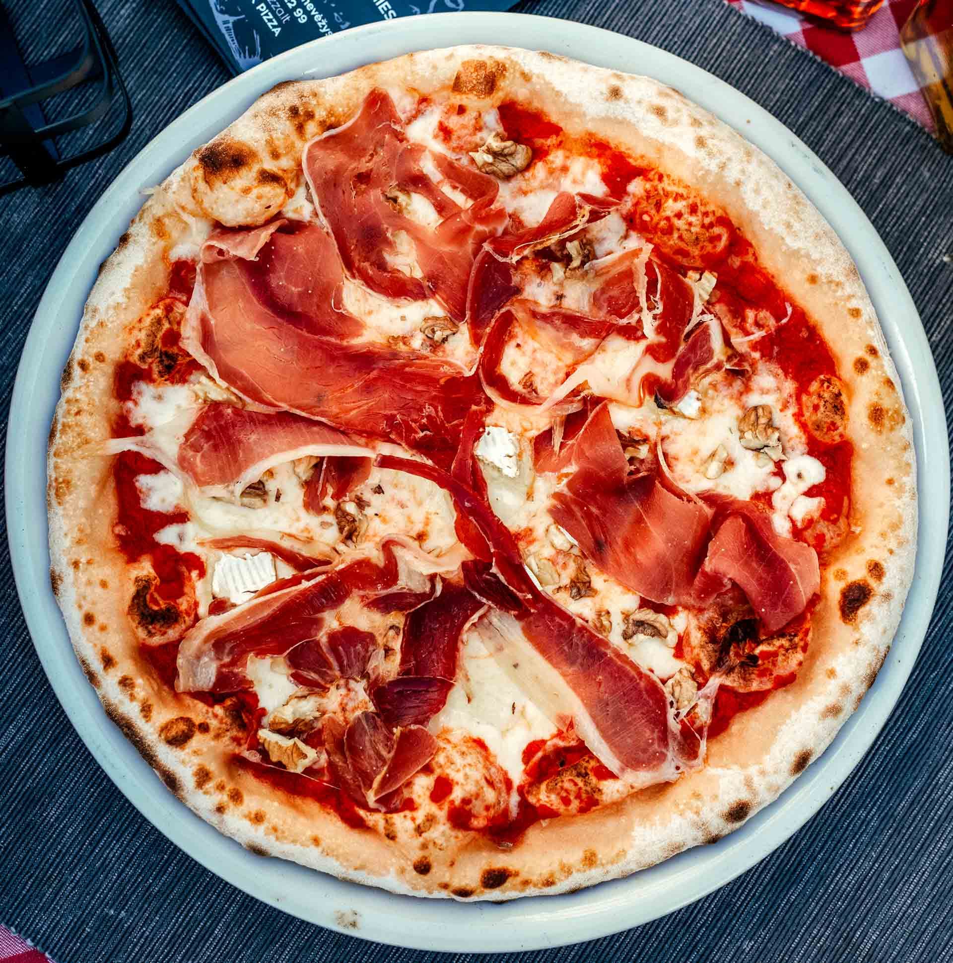 Pomidorų padažas, mocarelos sūris, bri sūris, vyt. kumpis, graikiniai riešutai