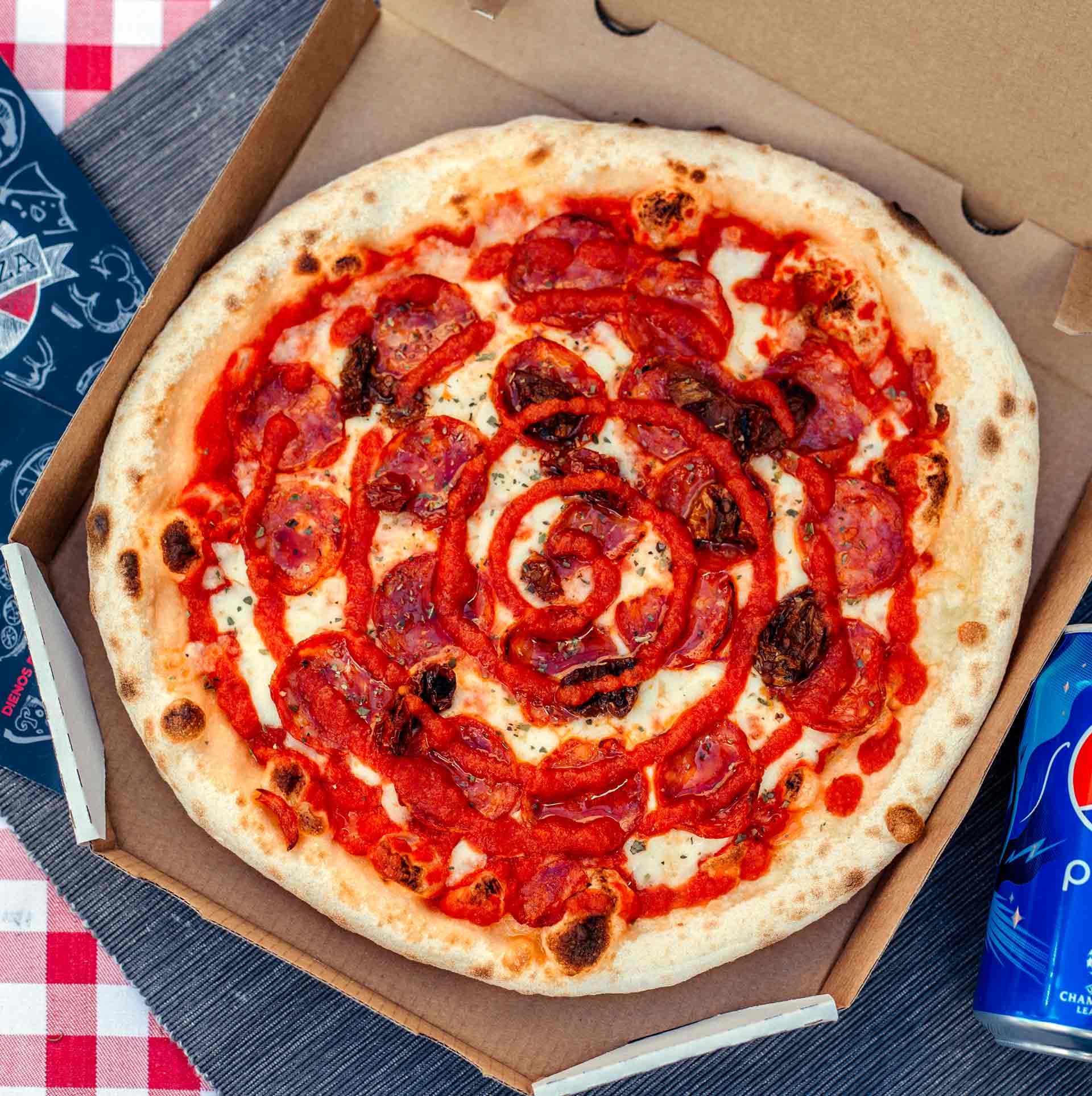 Pomidorų padažas, mocarelos sūris, aštrus saliamis, česnakinis padažas, džiovinti pomidorai