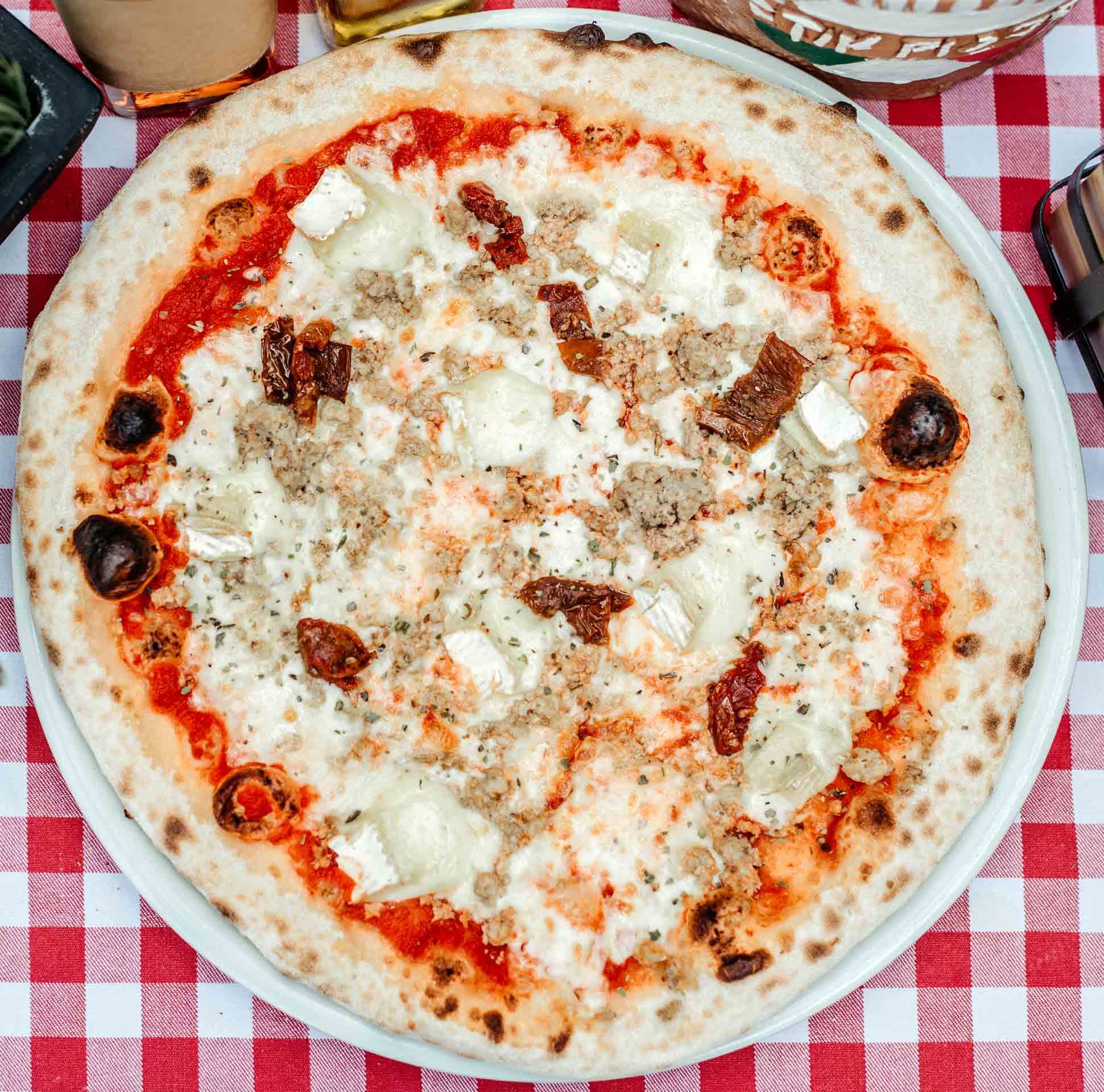Pomidorų padažas, mocarelos sūris, faršas, bri sūris, saulėje džiovinti pomidorai